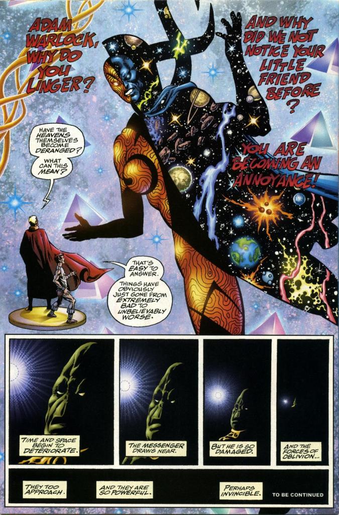 His old friend Pip the Troll discovers Adam’s cocoon stuck in an intergalactic insane asylum. This is delivered to Thanos, who is forced to recruit the psychic Moondragon to probe Adam’s sleeping consciousness. By the end of the first issue we know at least that this is not the true Thanos, but four of his illegitimate clones, guiding the Universe towards oblivion. But who is the mysterious mystic bookending these stories?